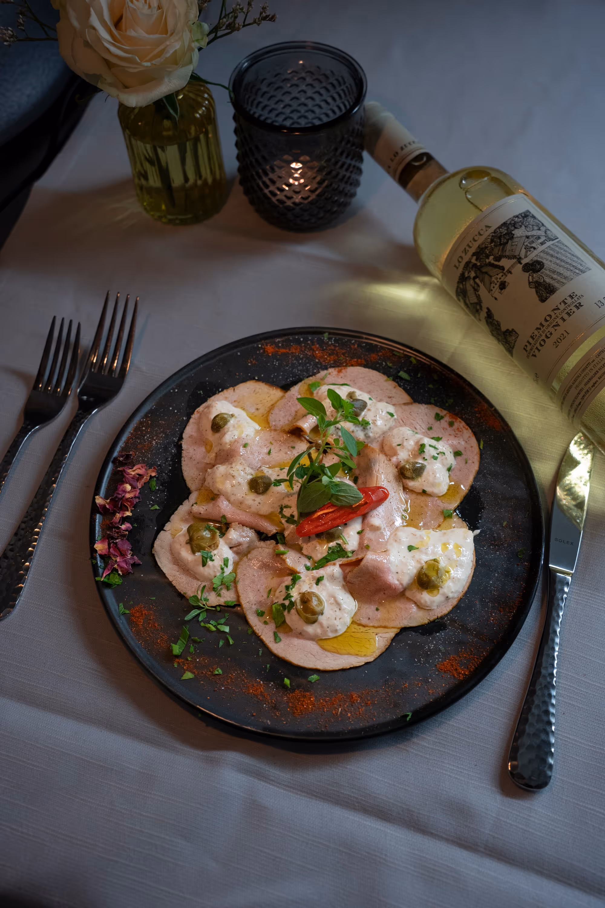 Carne cruda all’Albese di vitello su specchio di grana padano liquido nocciole piemontesi tostate
